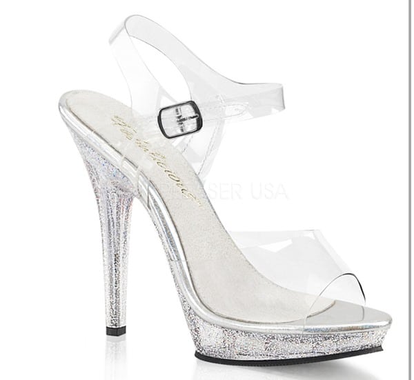 5” Heel with 3/4” platform ankle strap featuring mini iridescent glitter on entire bottom